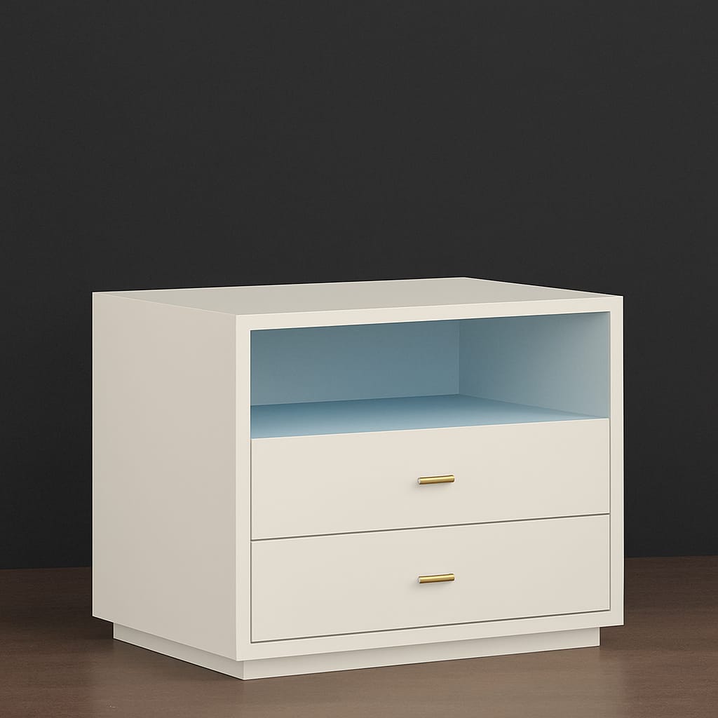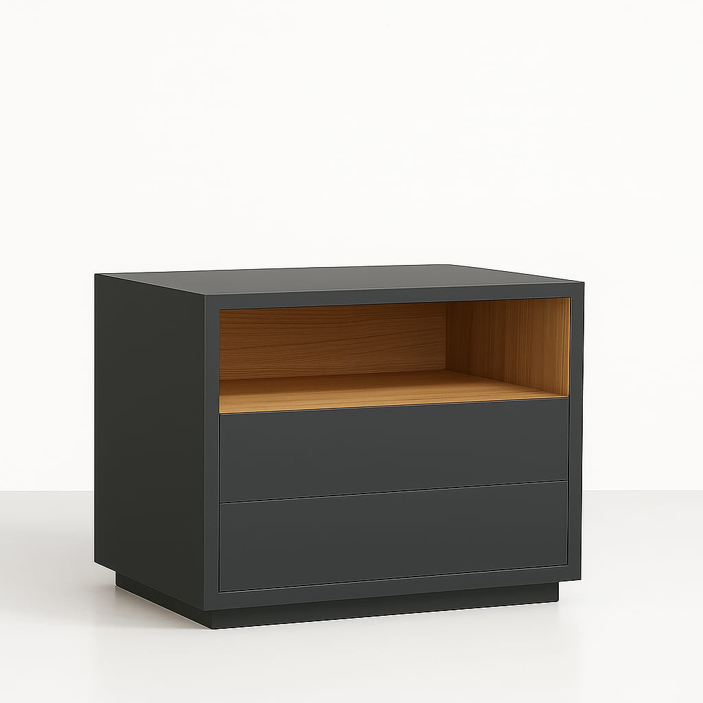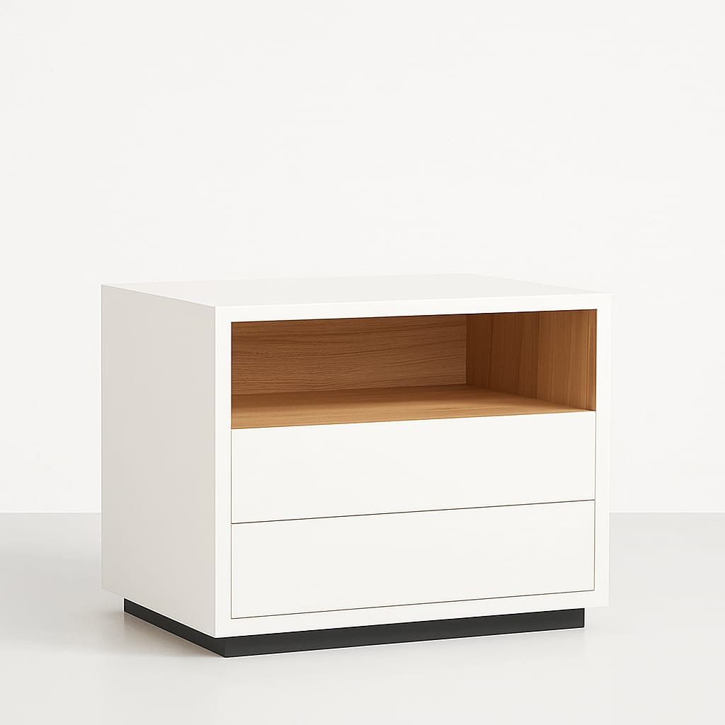 Sleek and minimal, this custom-built nightstand combines elegant finishes with warm, natural wood tones for a contemporary look that fits effortlessly into any bedroom. Available in black, cream, and white.